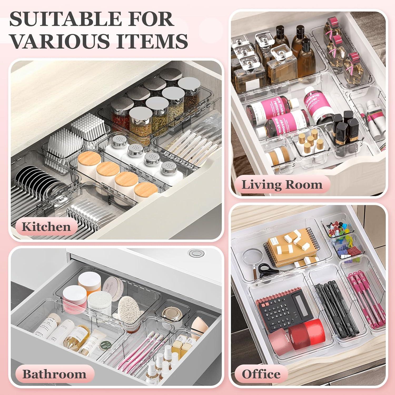 Versatile Storage: Adjustable Drawer Organizer suitable for various size drawers, such as kitchen drawers, vanity, office, bathroom, craft room. Helping you organize kitchen utensils, cosmetics, toiletries, office supplies, jewelry, craft supplies and more