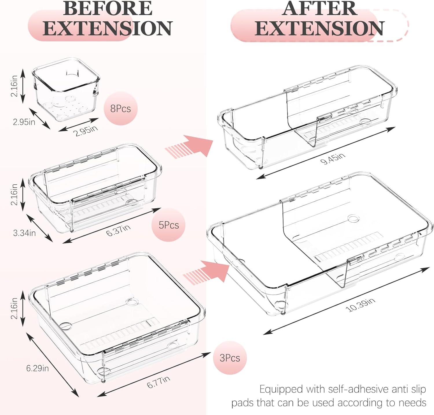 DILIBRA 16 Pcs Clear Extendable Drawer Organizer, Adjustable Drawer Storage 3-Size Desk Drawer Organizer, Plastic Non-Slip Storage Bins for Makeup, Cosmetic, Jewelries, Utensils, Stationery, Dressers(3Pcs Large + 5Pcs Medium + 8Pcs Small)