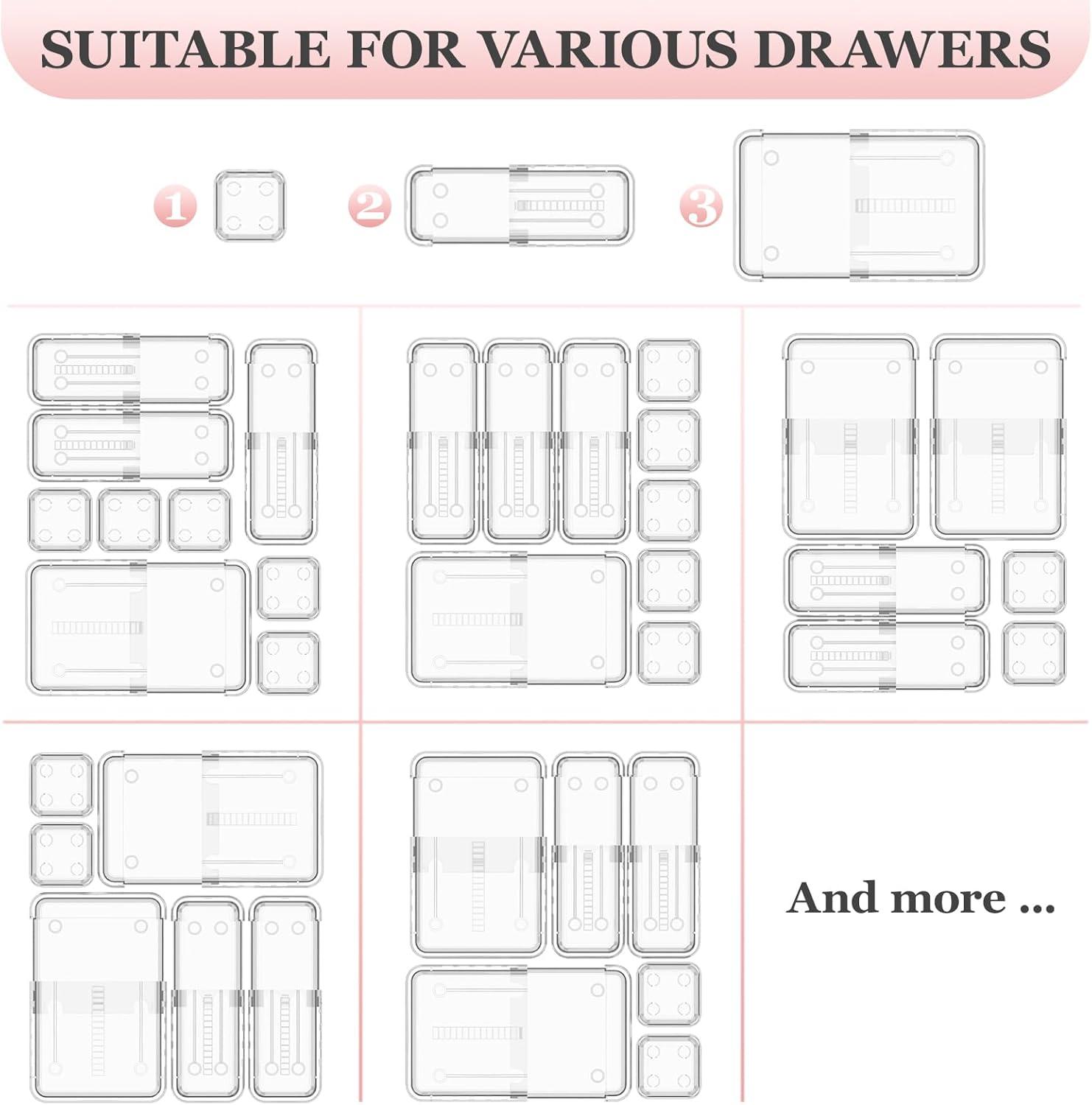 16 Piece Adjustable Drawer Organizer Set: Includes 3 different sizes—3 large adjustable organizer (7-10 x 6.2 x 2.2 inches), 5 medium adjustable organizer (6.4-9.4 x 3.4 x 2.2 inches), and 8 small fixed organizer (2.9 x 2.9 x 2.2 inches). This versatile storage set can be flexibly combined, is perfect for organizing drawers of different sizes