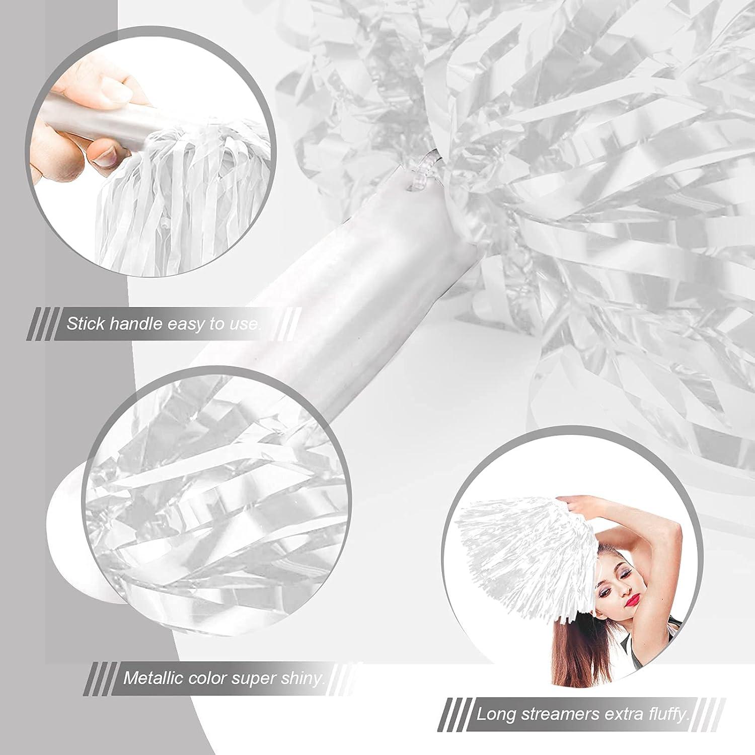 DILIBRA 24 Pcs Metallic Cheerleading Pom Poms for Kids, Cheerleaders Cheer Pom Poms with Baton Handle, Cheering Squad Hand Flower for Adults Team Spirit Sports Game Dancing Party(White)